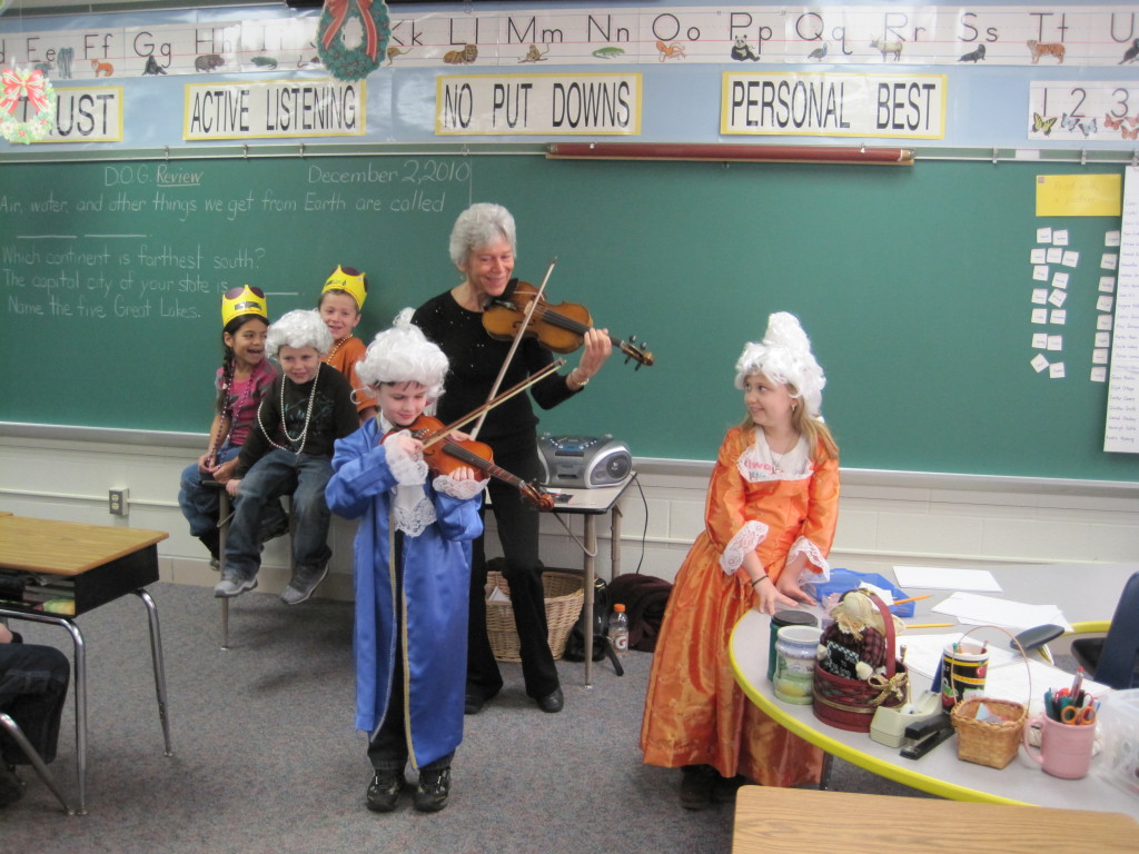 With the students Caroline takes a trip back in time, landing in the mid 18th century where they meet young Mozart and his sister and experience life with them from getting their carriage stuck in the mud to wearing white wigs and period costumes and playing a little violin. By the time they hear songs from The Magic Flute, they are mesmerized by the story of that opera and eager to draw pictures of its fascinating characters.